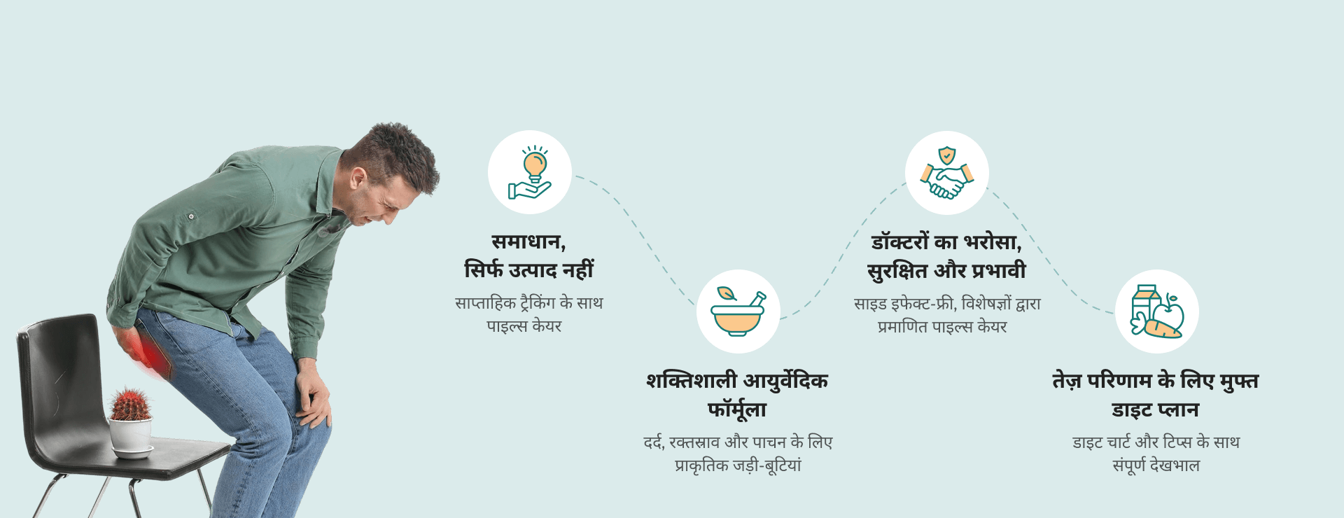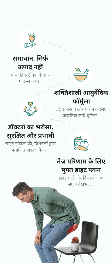 डॉक्टर मंत्रा पाइल्स केयर एक 360 डिग्री उपचार है जिसमें कैप्सूल, जूस, डाइट चार्ट और डॉक्टर से परामर्श शामिल है जो बवासीर के सभी लक्षणों जैसे मल त्याग में कठिनाई, रक्तस्राव और दर्द, बवासीर के मूल कारण को ठीक करने के लिए समग्र रूप से काम करता है।